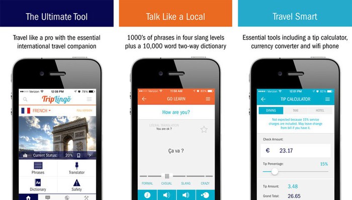 Ứng dụng này có 2.000 cụm từ và từ lóng của 13 ngôn ngữ có sẵn, cho phép bạn học nhanh các từ này bằng cách phát âm, câu đố, trò chơi… Ngoài ra, TripLingo cũng cho phép bạn học thêm về văn hoá, các mẹo du lịch và gọi bất kỳ số điện thoại quốc tế nào thông qua WiFi.